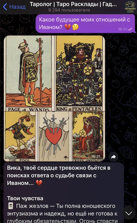 Бот работает круглосуточно в Telegram — гадайте когда удобно вам